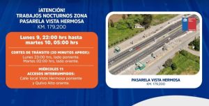 Los trabajos se realizarán en horario nocturno, con la debida coordinación de Carabineros, y se extenderán hasta las 05:00 horas del día siguiente.